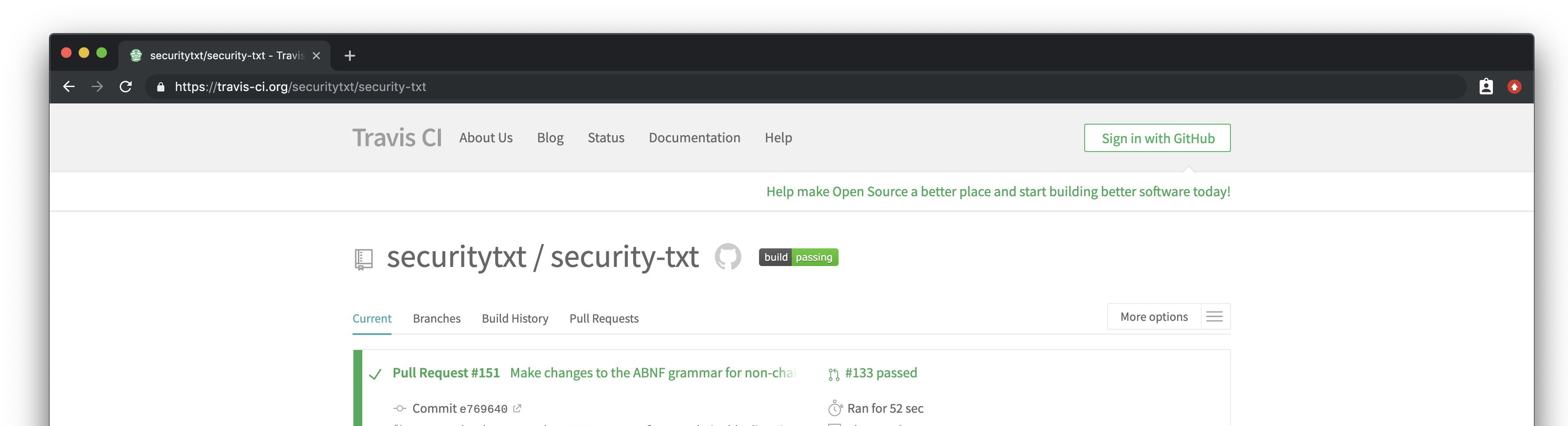 The security.txt project, for instance, uses Travis CI to build new draft documents whenever a commit is pushed. This allows the team to quickly determine if any further changes to the specification could potentially break the Internet Draft when compiled using kramdown-rfc2629 — a tool that enables one to write everything in Markdown and then convert it to XML2RFC XML markup.